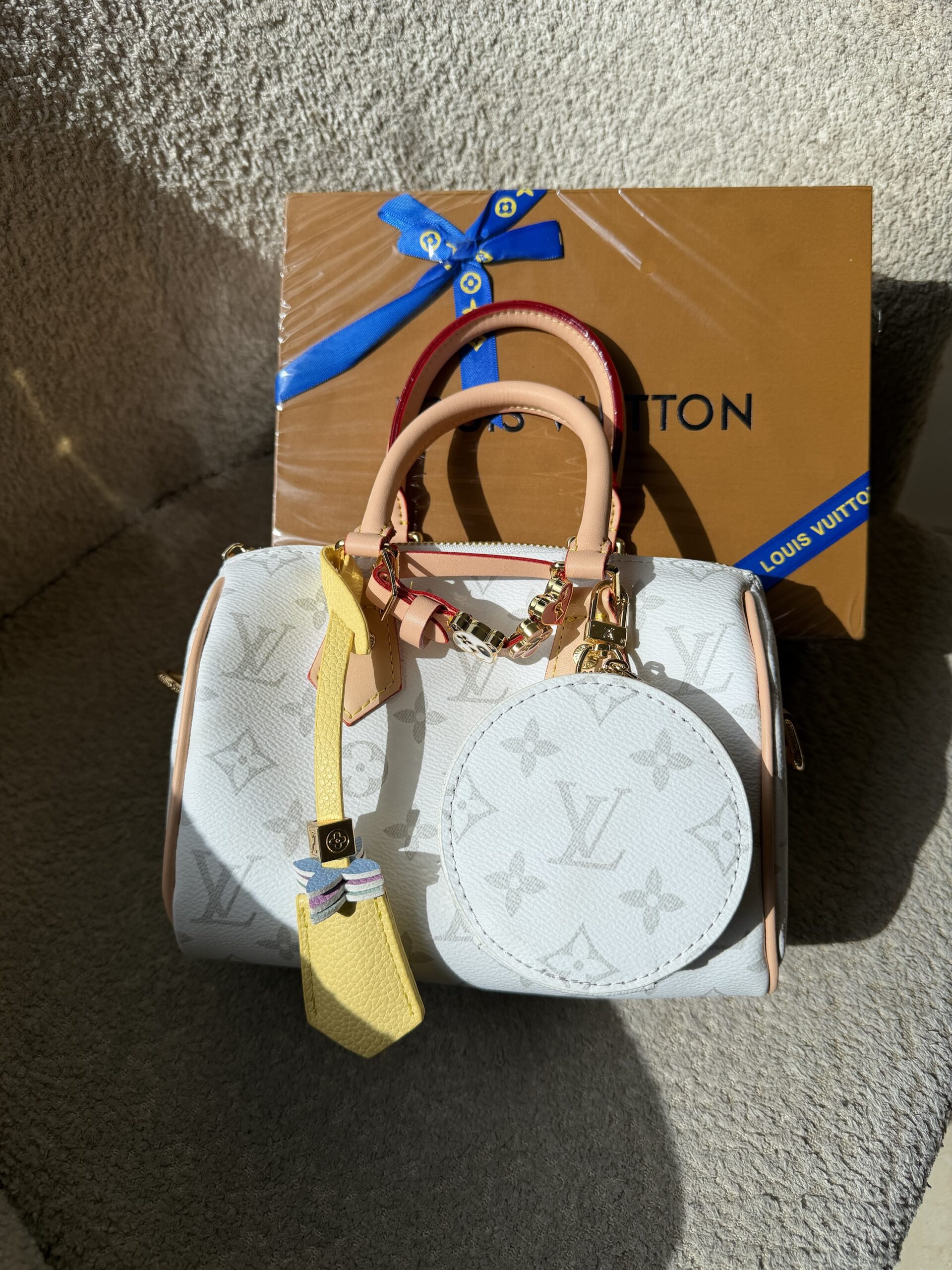 شنطة الڤي سبيدي لون ابيض ستراب عريض ومعها تشارمز شامل علبة
